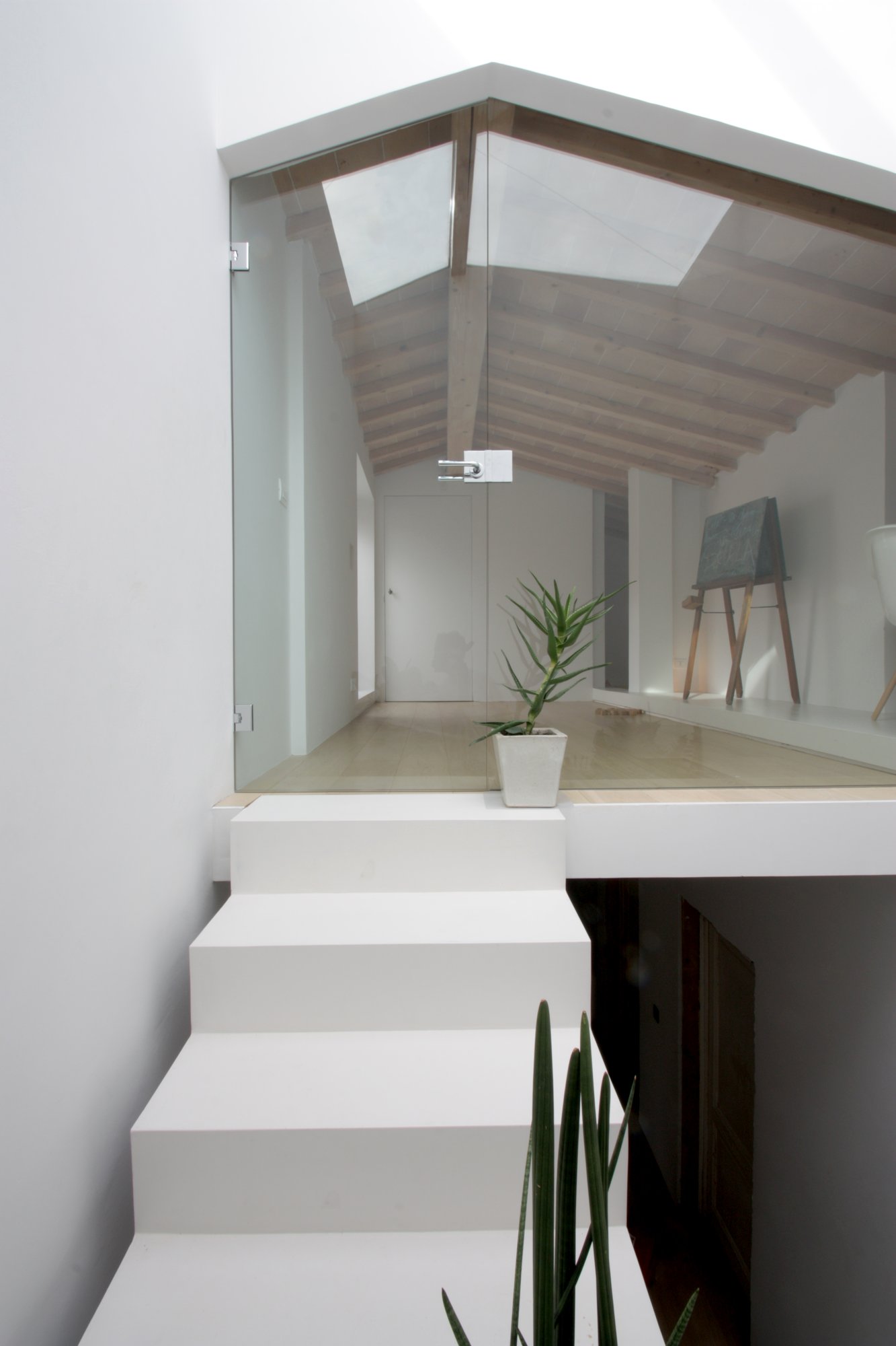 The existing staircase, simplified in its shape, develops like a sculpture towards the large skylight on the roof that illuminates the house during all times of the day.